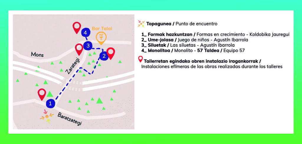 Bisitak amaitzean, BAR TALAI erabilera anitzeko gelan elkartuko gara. Bertan, Intxaurrondoko Arte Publikoko BAI Topaketetan gertatutakoa laburbilduko duen bideo bat proiektatuko da.